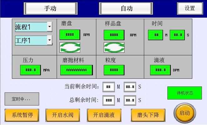 2) 單工序模式:根據(jù)每一步磨拋工序,可設置和調(diào)用30種工序參數(shù):磨盤和磨頭轉(zhuǎn)動速度、磨拋時間、水通斷……